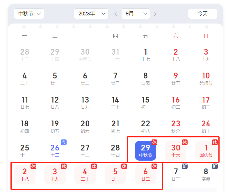 根據(jù)《國務(wù)院辦公廳關(guān)于2023年部分節(jié)假日安排的通知》,國慶節(jié)放假時間為9月29日至10月6日放假調(diào)休,共8天。10月7日(星期六)、10月8日(星期日)上班。